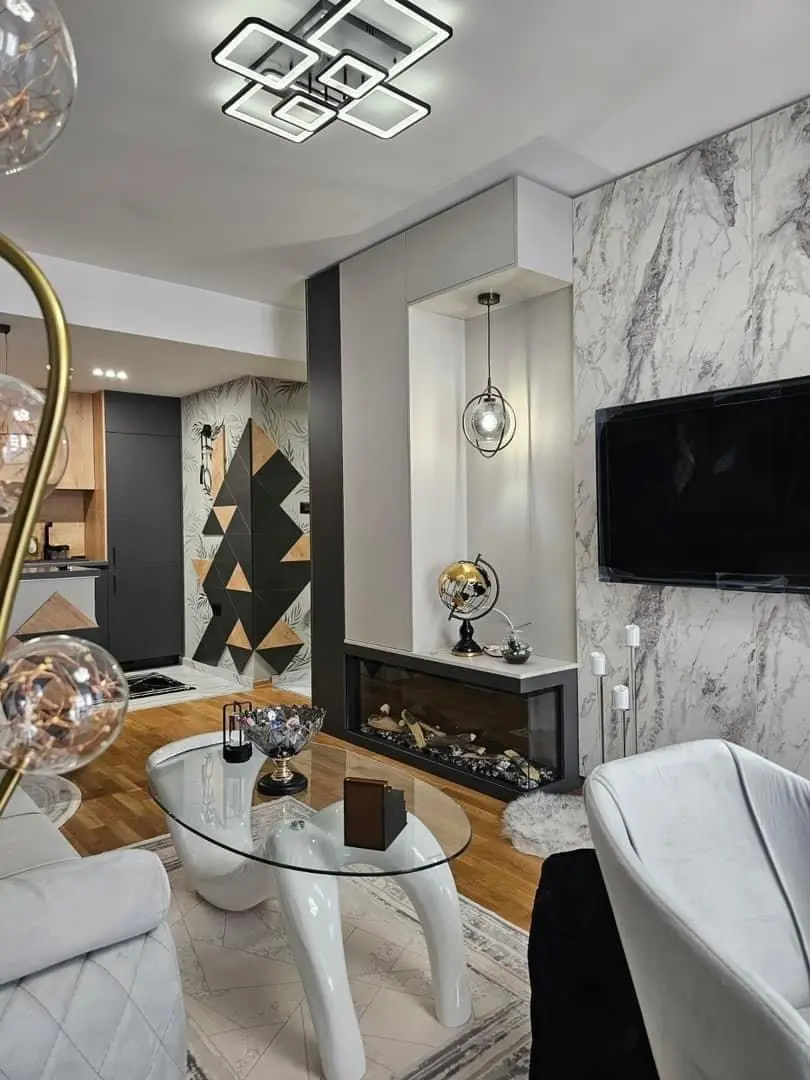 Тространиот камин создава импресивен впечаток.
