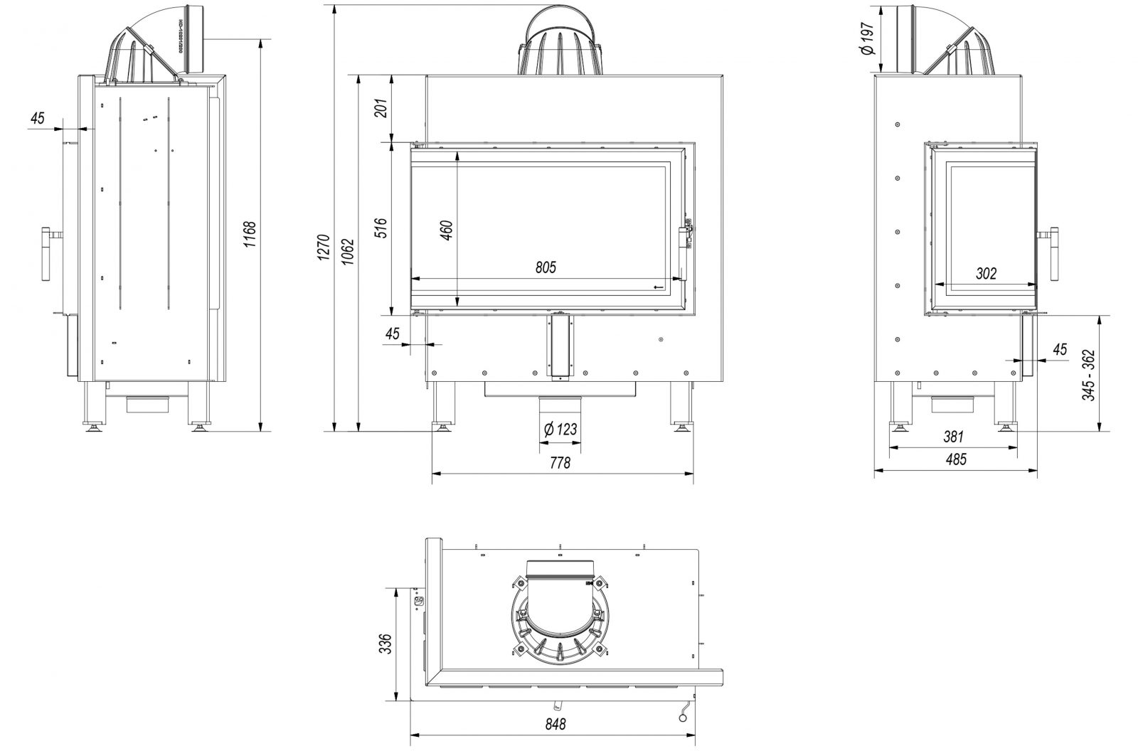 - Дополнително, вградениот елемент е опремен со систем за чисто стакло (воздушна завеса), каде воздухот се доведува директно до стаклото преку канали поставени на страните од каминот. Така се доведува кислород до горниот дел од комората, каде се случува пост-согорување на гасовите, со што се намалува емисијата на штетен CO.