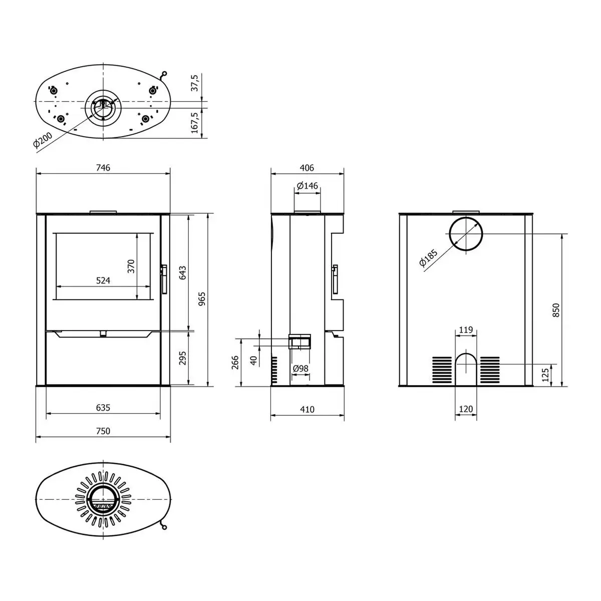 - Приклучокот за димовод има дијаметар од 150 mm и може да се постави одозгора или одзади.